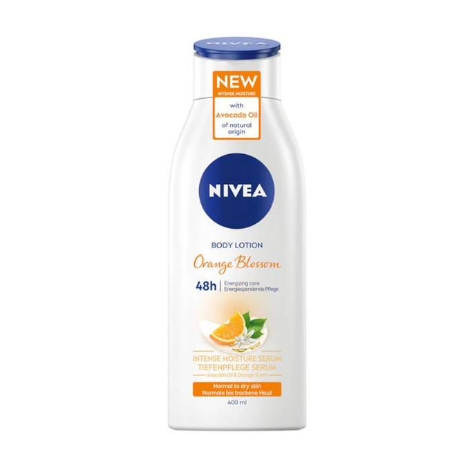 NIVEA® Balsam do ciała z Kwiatem Pomarańczy wzbogacony jest o GŁĘBOKO NAWILŻAJĄCE SERUM i naturalny olejek z awokado. Zapewnia skórze intensywne nawilżenie przez 48h, oraz uczucie gładkiej skóry już po pierwszym zastosowaniu. Formuła o energetyzującym zapachu kwiatu pomarańczy szybko się wchłania i pozostawia skórę pełną blasku. Tolerancja dla skóry potwierdzona dermatologicznie.