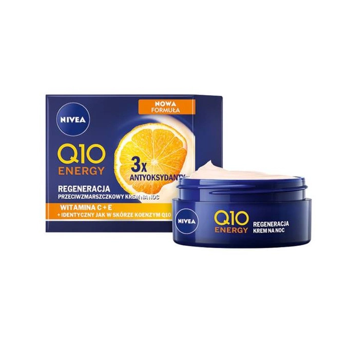 Poznaj NIVEA Q10 Energy Regeneracja Przeciwzmarszczkowy krem na noc, który wspiera własną zdolność skóry do poprawy metabolizmu energetycznego* i chroni ją przed szkodliwymi dla skóry wolnymi rodnikami. NIVEA Q10 Energy łączy w sobie siłę 3 antyoksydantów: koenzymu Q10, w 100% identycznego jak w skórze oraz witamin C i E. Zapewnia promienność i zdrowy wygląd skóry w 8h. Niweluje oznaki zmęczenia skóry i redukuje zmarszczki. Zatrzymuje nawilżenie w skórze i wzmacnia jej barierę ochronną. Sprawia, że skóra wygląda młodziej i jest bardziej jędrna w 2 tygodnie. Dzięki owocowemu zapachowi z naturalnym wyciągiem z pomarańczy i lekkiej formule krem jest wyjątkowo przyjemny w stosowaniu. Tolerancja dla skóry potwierdzona dermatologicznie.