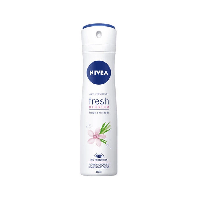 Antyperspirant NIVEA Fresh Blossom zachwyca swoim wyjątkowym zapachem oraz zapewnia skuteczną ochronę przed poceniem. Odświeżający, delikatny zapach łączy w sobie kwiatowe nuty z orzeźwiającą trawą cytrynową. Zapewnia natychmiastowe odświeżenie i energetyczną dawkę świeżości. Formuła zapewnia niezawodną, 48 godzinną ochronę przed nieprzyjemnym zapachem. Jest doskonałym połączeniem niezawodnej ochrony antyperspirantu i łagodnej pielęgnacji NIVEA. Nie zawiera alkoholu etylowego, a jego łagodność dla skóry została potwierdzona dermatologicznie.