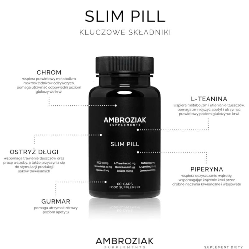 - Slim Pill to idealne wsparcie w dążeniu do idealnej sylwetki. Dzięki chromowi, L-karnitynie, zielonej herbacie oraz pieprzowi czarnemu pomaga kontrolować masę ciała, wspiera metabolizm oraz ułatwia spalanie tłuszczów.