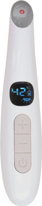Przygotowanie: Nałóż równomiernie na skórę pod oczami ilość kremu pod oczy lub serum wielkości ziarnka grochu. Uwaga: Nie używaj urządzenia bez uprzedniego zastosowania produktu do pielęgnacji skóry! Naciśnij i przytrzymaj przycisk zasilania, aby włączyć masażer. Naciśnij przyciski "+" i "-", aby ustawić temperaturę zgodnie z wymaganiami. Wybierz preferowany tryb (1, 2 lub 3), krótko naciskając przycisk zasilania. Zastosowanie: Dolna powieka: Umieść końcówkę masażera w kąciku oka pod dolnymi rzęsami, a następnie przesuwaj delikatnie w kierunku zewnętrznego kącika oka. Ruch od wewnętrznego do zewnętrznego kącika oka powinien trwać około 15 sekund, aby masażer miał czas na rozgrzanie skóry. Powtórz ten ruch jeszcze raz lub dwa razy, ale nie dłużej niż 60 sekund na tym samym obszarze skóry. Powtórz ten proces również na drugim oku. Górna powieka: Użyj urządzenia na górnej powiece nad rzęsami w taki sam sposób jak na dolnej powiece, najlepiej używając trybu 3 z wyłączonym czerwonym światłem LED. Wszystkie 3 tryby wykorzystują terapię termiczną, podczas której ciepło pomaga odblokować gruczoły nad i pod okiem, zmniejszając podrażnienia i uczucie ciężkości. Tryb 3 oferuje również masaż wibracyjny, który wspomaga drenaż limfatyczny. Dzięki temu powieki górne i dolne są widocznie mniej opuchnięte. W trybie 2 dodana jest funkcja czerwonego światła LED, która wspomaga regenerację kolagenu i elastyny, co zapewnia gładszy wygląd skóry. Tryb 1 wykorzystuje wszystkie funkcje, aby osiągnąć pełne korzyści z termoterapii, masażu wibracyjnego i terapii światłem czerwonym LED.