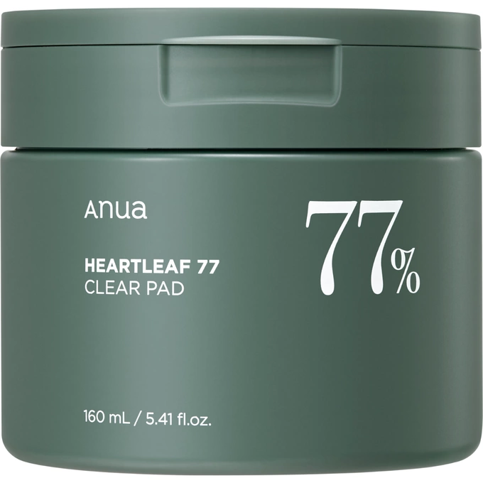 Anua Heartleaf 77% Clear Pad to tonik w płatkach przeznaczony do delikatnego złuszczania martwych komórek naskórka w celu wygładzenia i oczyszczenia cery. Idealny tonik do codziennego stosowania, który natychmiast łagodzi podrażnienia i pomaga zmniejszyć pory. Usuwa martwe komórki naskórka i sebum za pomocą PHA, aby wygładzić teksturę skóry. Zawiera 77% ekstraktu z liści pstrolistki sercowatej, znanego ze swoich właściwości uspokajających. Doskonale przygotowuje skórę przed makijażem, nadając jej promienny wygląd.