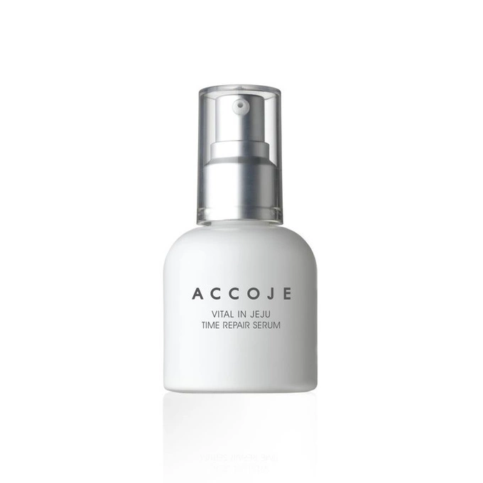 Poznaj serum Vital in Jeju Time Repair od marki Accoje, stworzone, by aktywnie walczyć z oznakami starzenia i przywracać skórze witalność. To bogate, ale szybko wchłaniające się serum dostarcza skoncentrowaną dawkę odżywczych i przeciwzmarszczkowych składników prosto z czystej Wyspy Jeju.
