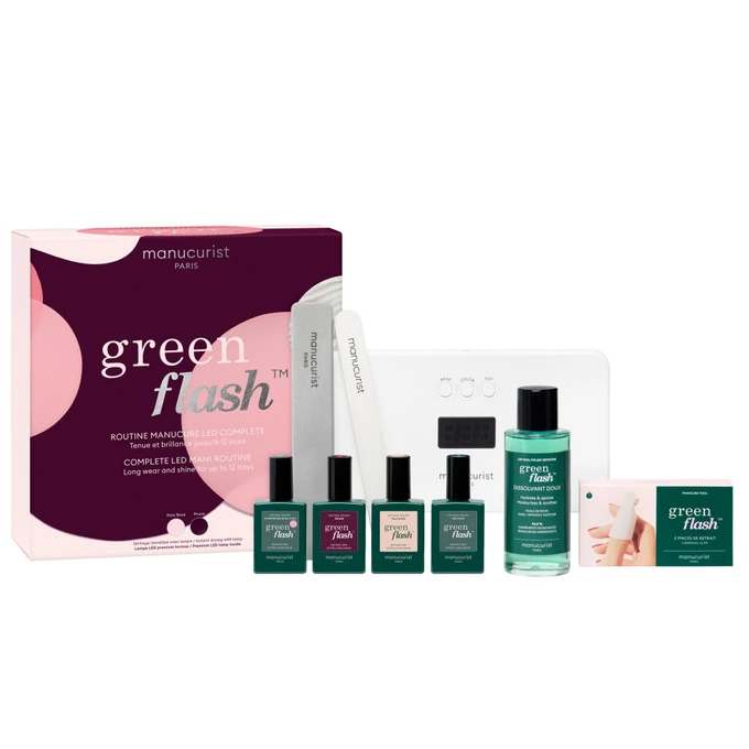 Zestaw zapewnia kompletną rutynę Manucurist Green Flash, od przygotowania paznokci po utwardzenie i usunięcie lakieru: