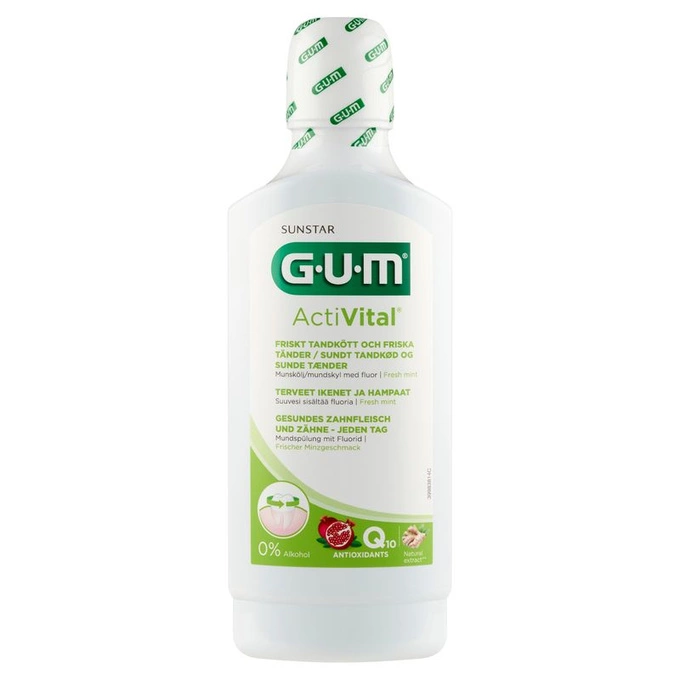 Sunstar GUM ActiVital to wielozadaniowy płyn do płukania jamy ustnej, stworzony by wspierać zdrowie zębów oraz dziąseł. Zawiera koenzym Q10, ekstrakt z owocu granatu, wyciąg z imbiru i rumianku.